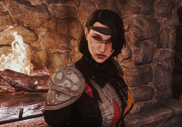 APPEARANCE: Though short and buxom, she bears many scars along her body and face from an attack in her early life. Pale skinned, raven tresses and silver eyes, her appearance is striking. Beautiful. She is the image of a beauty hailing from the Karth.LIKES: Dantes. Colovian Wines and mead. Her dogs. The Empire, her Iron Lord and the red diamond. Forests and autumn nights.
